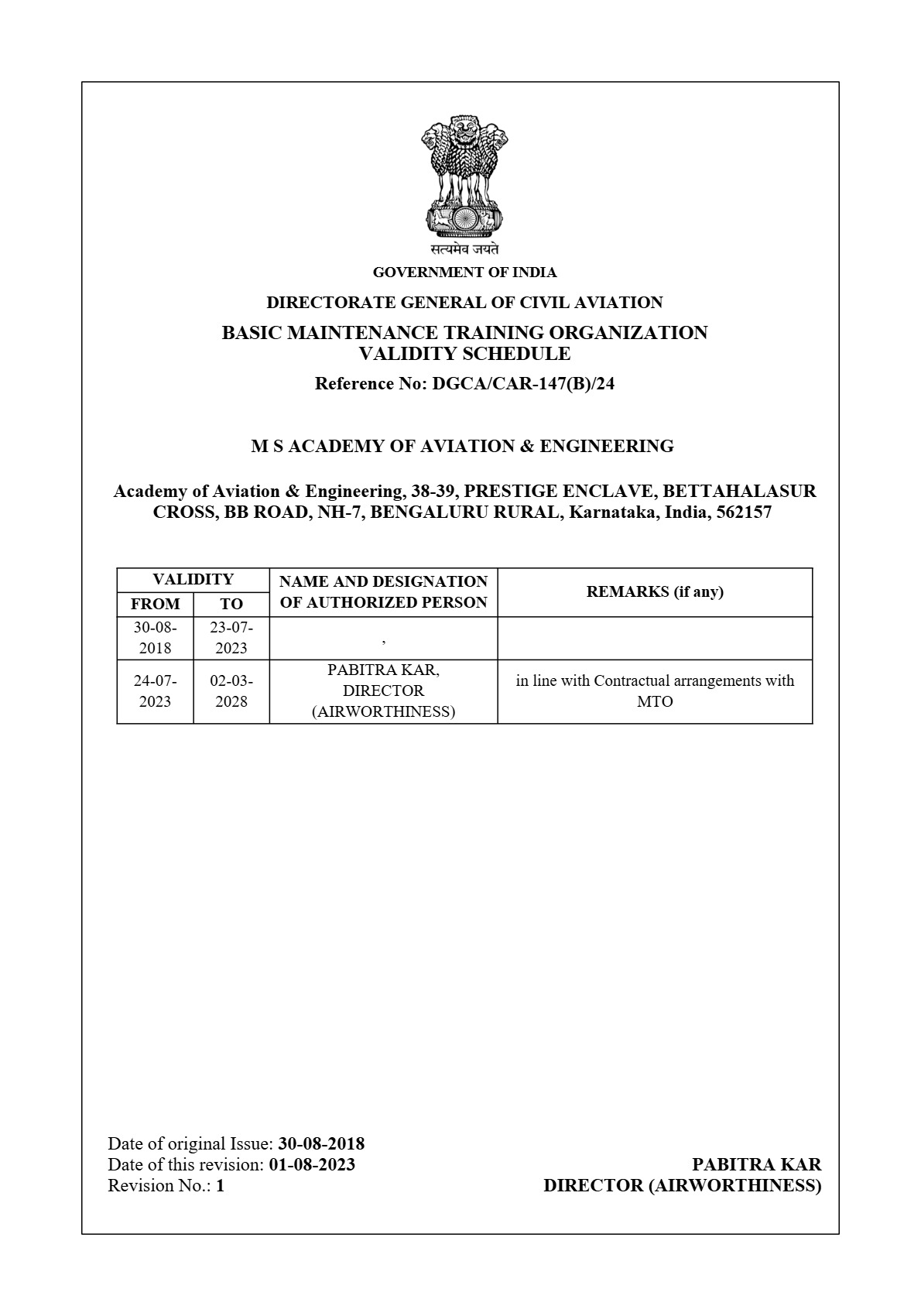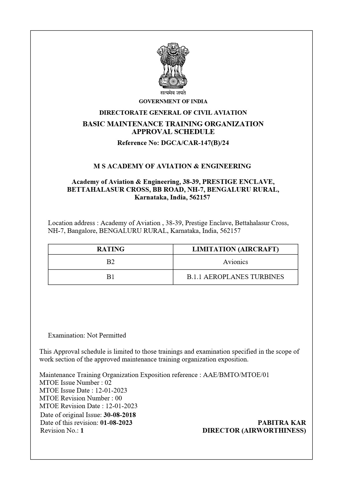 Academy of Aviation & Engineering is approved by the Directorate General of Civil Aviation, Government of India, for the following AME (Aircraft Maintenance Engineering) course at Bengaluru Centre for Basic License covering.